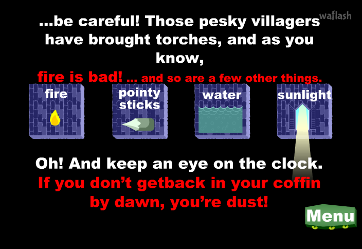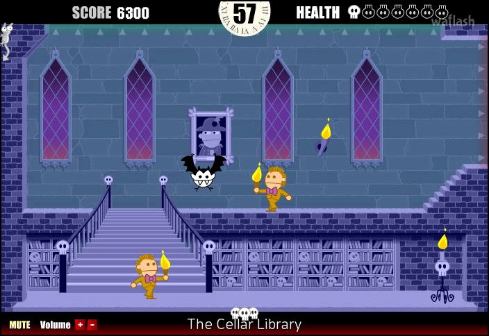 뱀파이어를 조종하여 장애물을 피해가며 자신의 성을 쳐들어온 사람들을 물리쳐나가는 게임입니다.