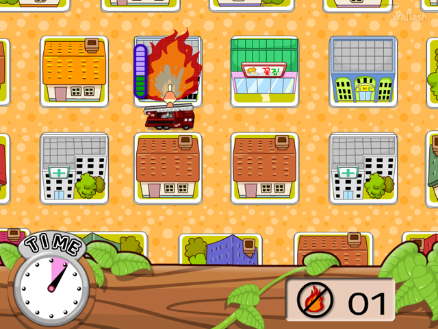 불이 난 집을 마우스로 클릭하면 소방차가 이동합니다.