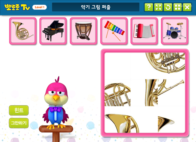 뒤섞여 있는 퍼즐을 맞춰 악기 그림을 완성하는 뽀로로 놀이교실: 해리의 음악·음률 놀이 악기 그림 퍼즐 플래시 게임입니다