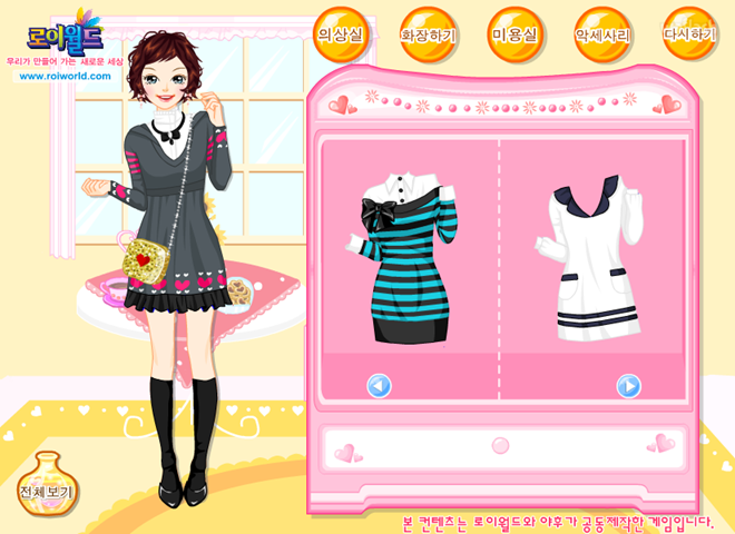 진열되어 있는 예쁜 옷과 악세사리들을 마우스로 클릭하여 캐릭터에 맞게 이쁘게 입혀 보세요.