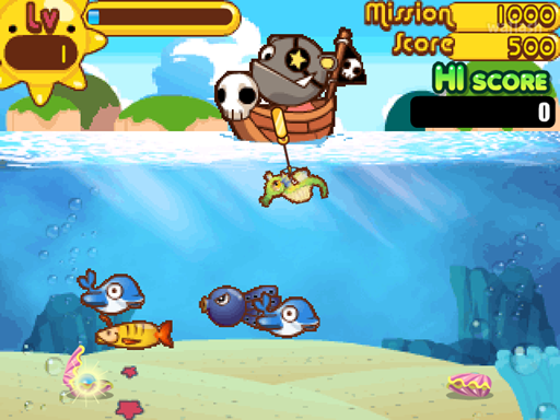 해적 선장이 되어 낚싯대를 조종해 바닷속 물고기를 낚는 해적 미션 낚시 플래시 게임입니다