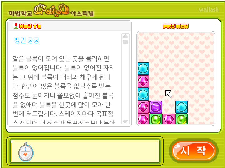 야후꾸러기 마법학교 아스티넬의 미니게임 펭귄쿵쿵 퍼즐 플래시게임입니다