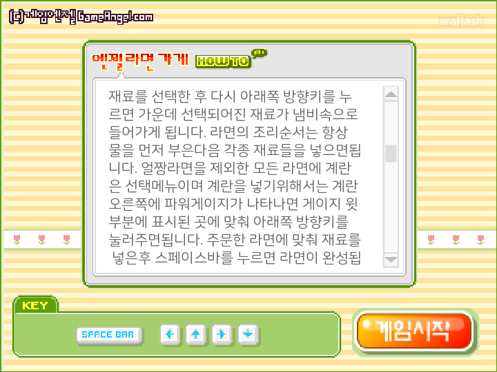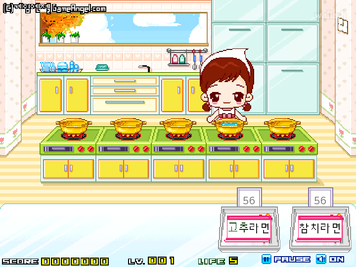 엔젤 라면 가게는 주문한 라면에 맞게 여러가지 재료를 넣어 주어진 시간내에 라면을 끓여내는 게임입니다