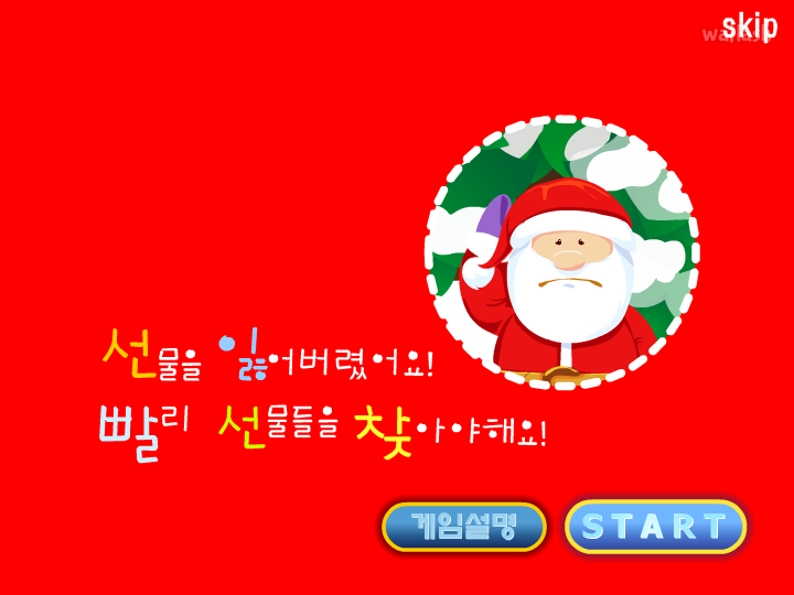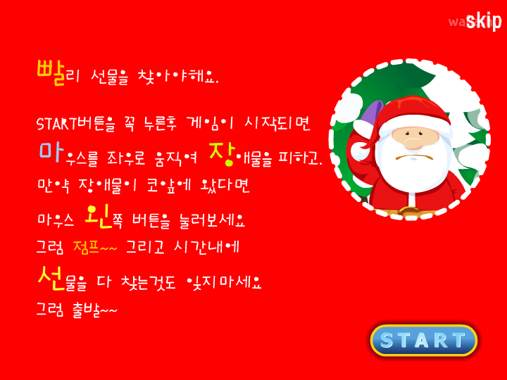 마우스를 좌우로 움직이고 점프하여 장애물을 피하면서 제한시간내에 선물을 다 찾아보아요!