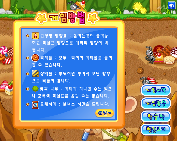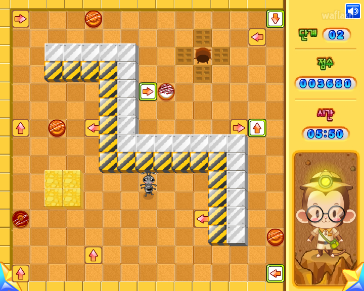 모든 과자를 먹고 개미굴로 들어갈 수 있게 길을 만들어주는 게임입니다