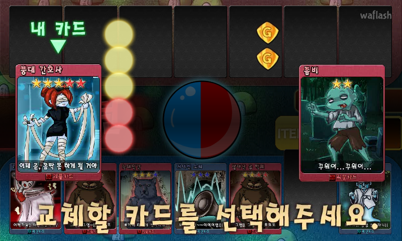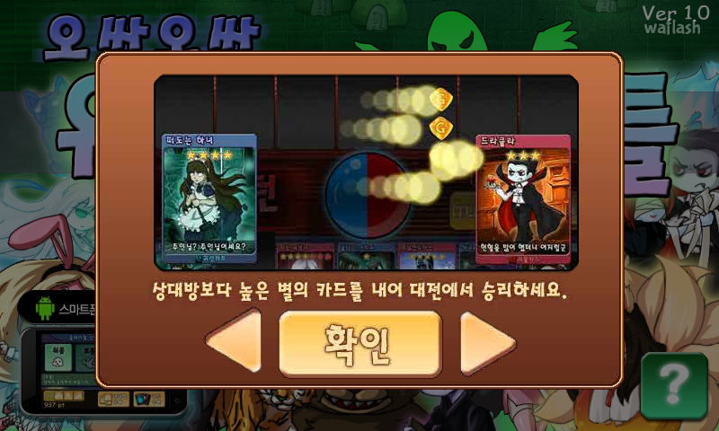 상대방보다 높은 별의 카드를 내어 승리하는 오싹오싹 유령카드 배틀 플래시 게임입니다