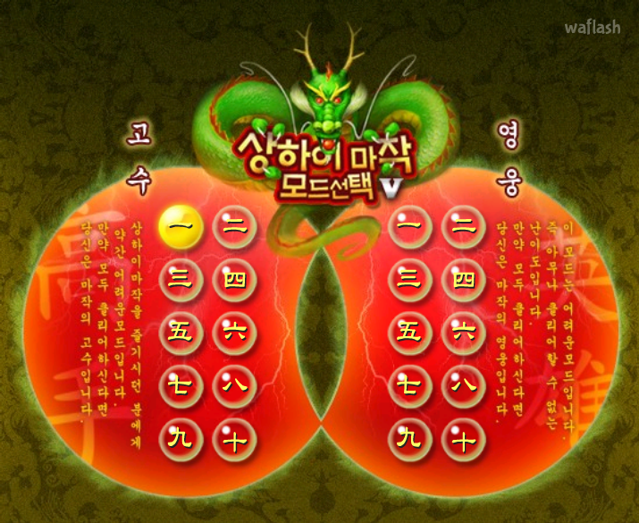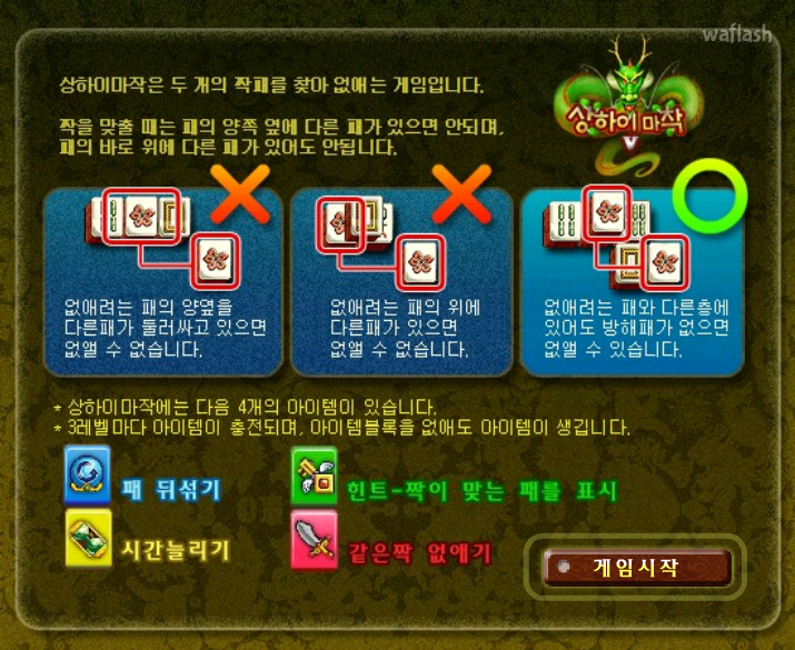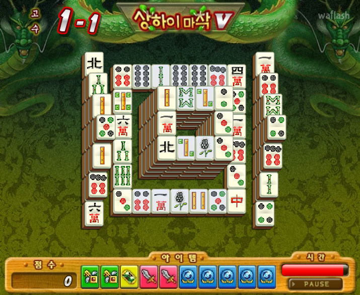 두개의 짝패를 찾아 연결하여 없애는 한게임플래시의 상하이마작V 플래시 게임입니다