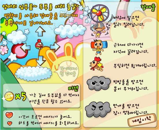 방향키를 사용해 장애물을 피해가며 두부가게로 날아가세요.