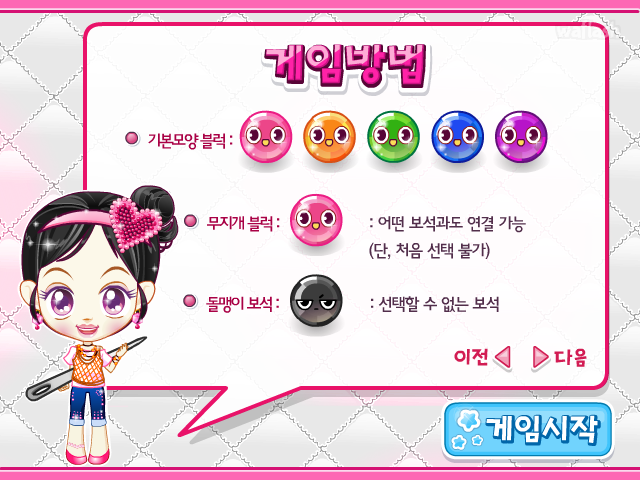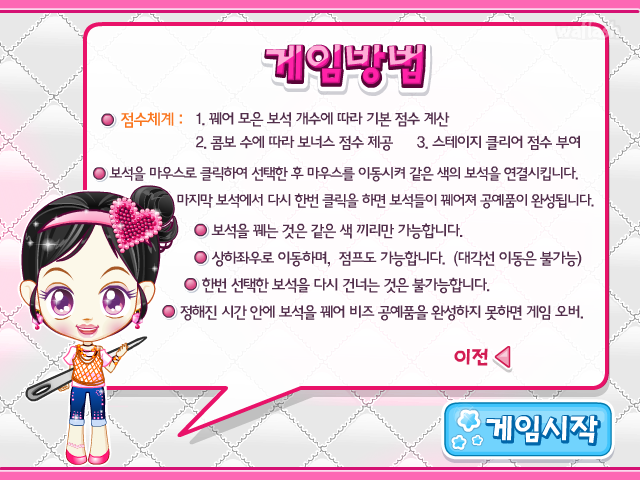 정해진 시간동안 같은색의 보석들을 3개 이상 차례로 꿰어 아름다운 장신구를 만드는 게임인