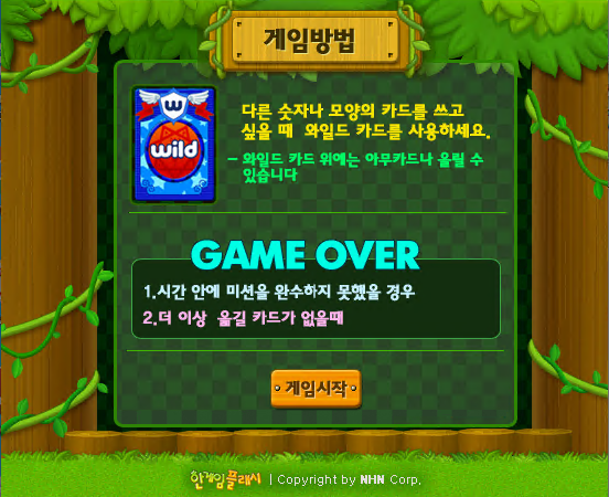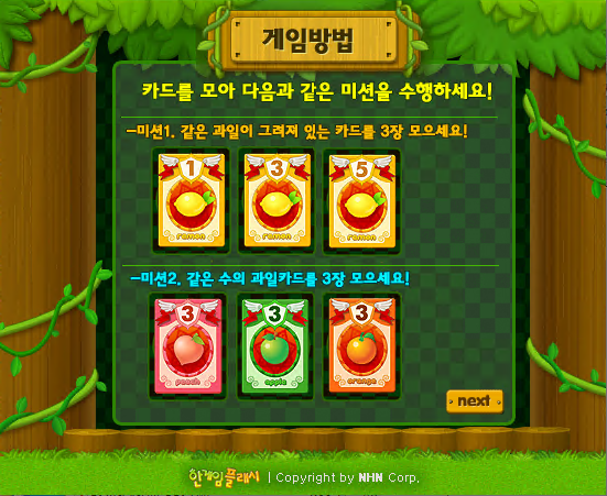 위쪽 3개의 카드란에 다시 클릭 또는 터치하여 미션을 완성하는 게임입니다.
